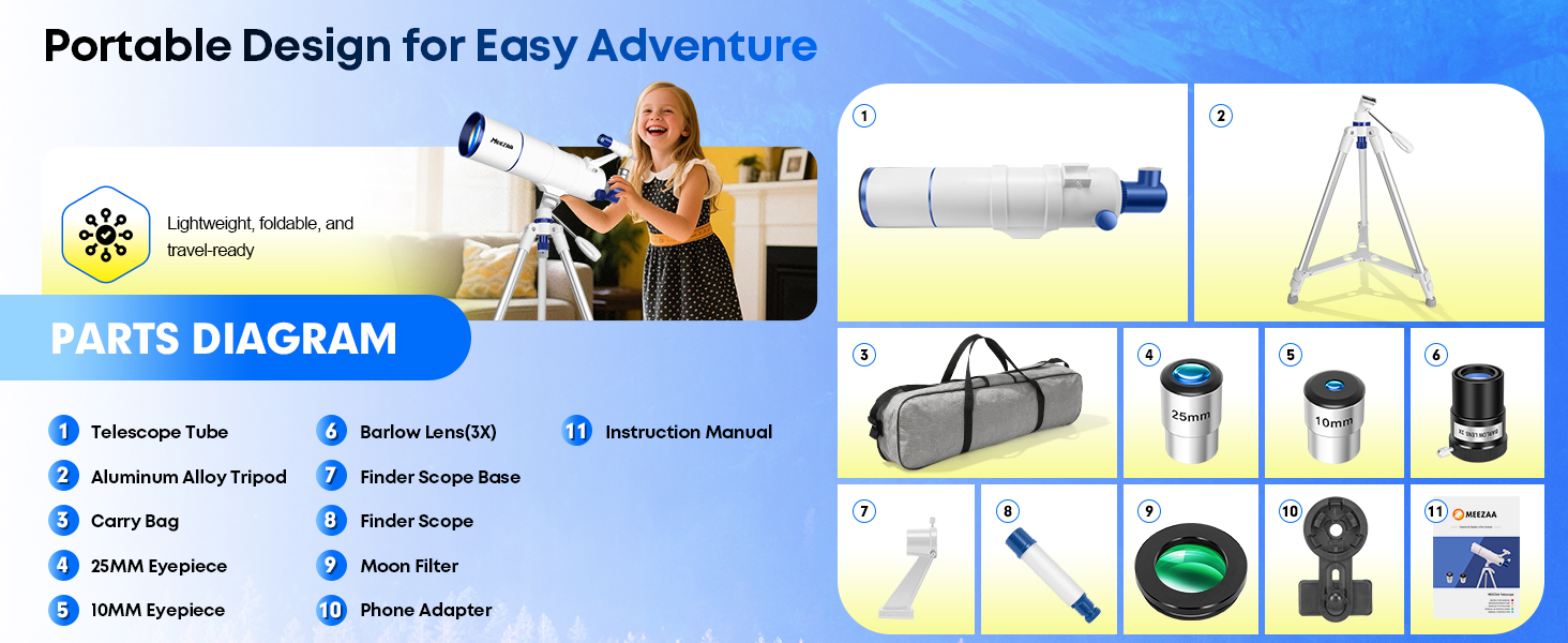 Inspire Curiosity for All Ages – Family Stargazing Fun: A perfect telescope for kids and adults who are new to astronomy, encouraging hands-on learning and discovery. Ideal for astronomy beginners to explore the Moon, planets and stars right from the back garden, at home, or on outdoor stargazing trips. With MEEZAA, exploring the night sky becomes easy, exciting and an unforgettable family experience