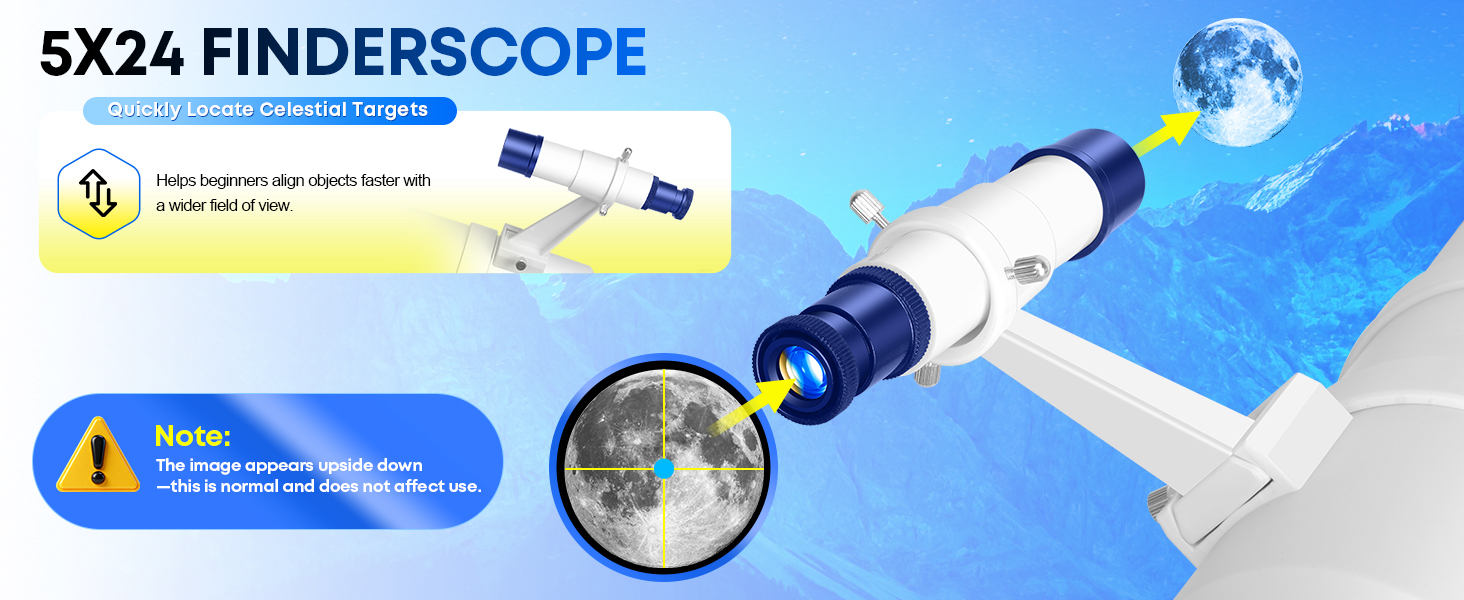 High Magnification (22X–165X) – Perfect for Lunar & Planetary Details: Comes with 25mm & 10mm eyepieces and a 3X Barlow lens, offering flexible magnification for discovering craters on the Moon. The 5×24 finder scope helps beginners quickly locate objects – great for family stargazing nights and learning astronomy together