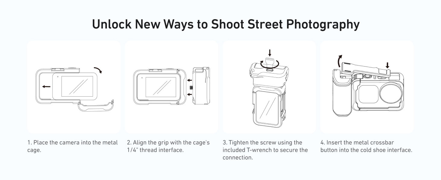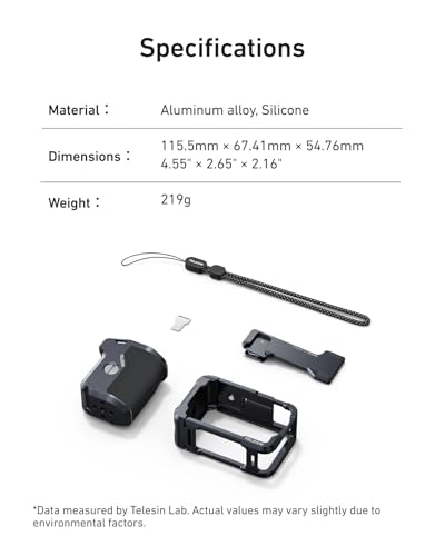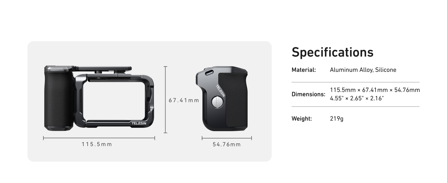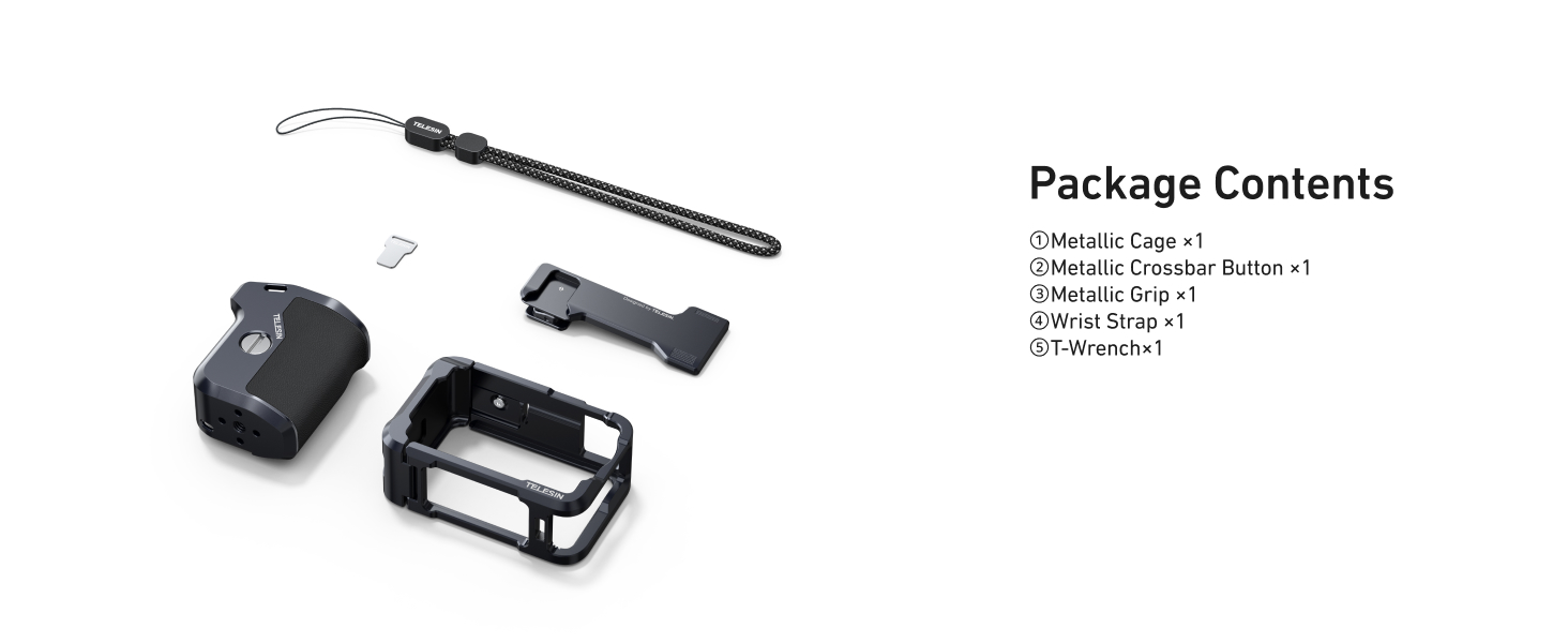 【Product List】TELESIN Ultra-Lightweight Camera Cage × 1, Camera Grip Handle × 1, Cold Shoe Button ×1, Wrist Strap × 1, T-Wrench ×1;NOTE:This TELESIN Camera Grip Only Matching TELESIN Ultra-Lightweight Cage To Be Used. Not compatible with other camera cages