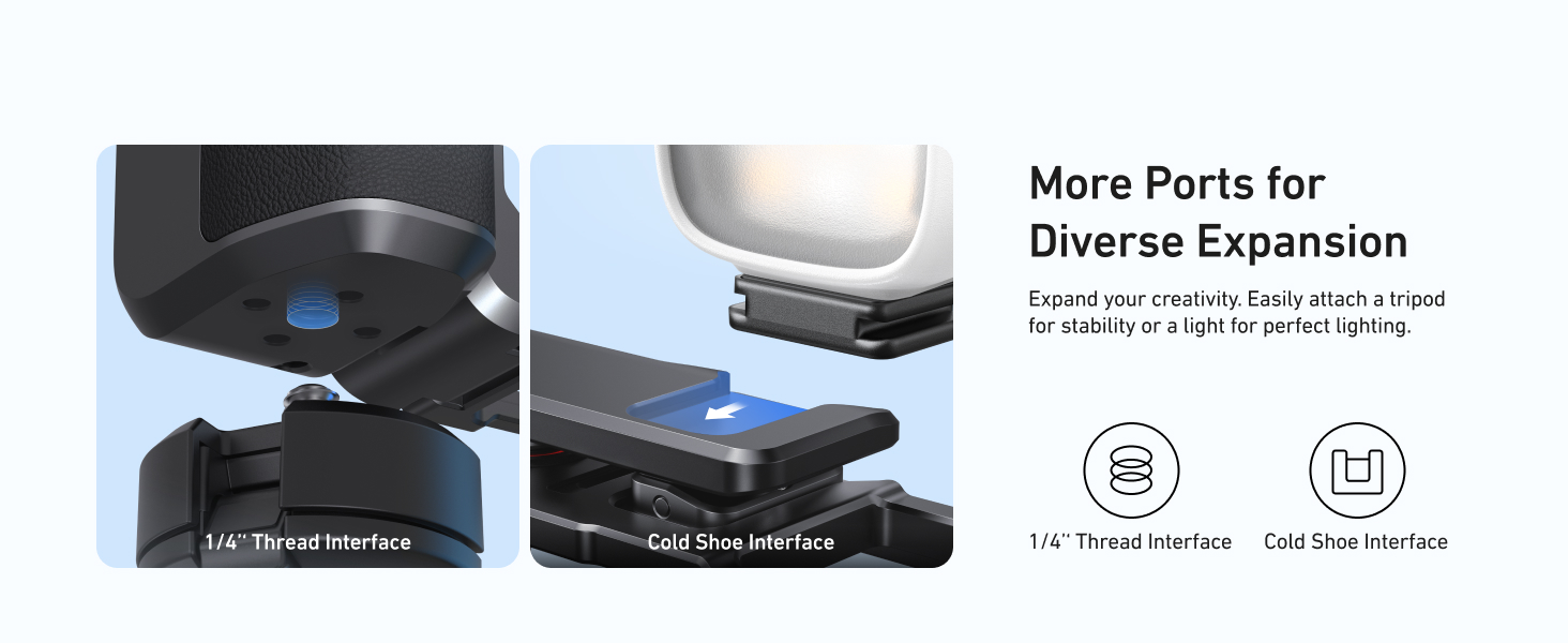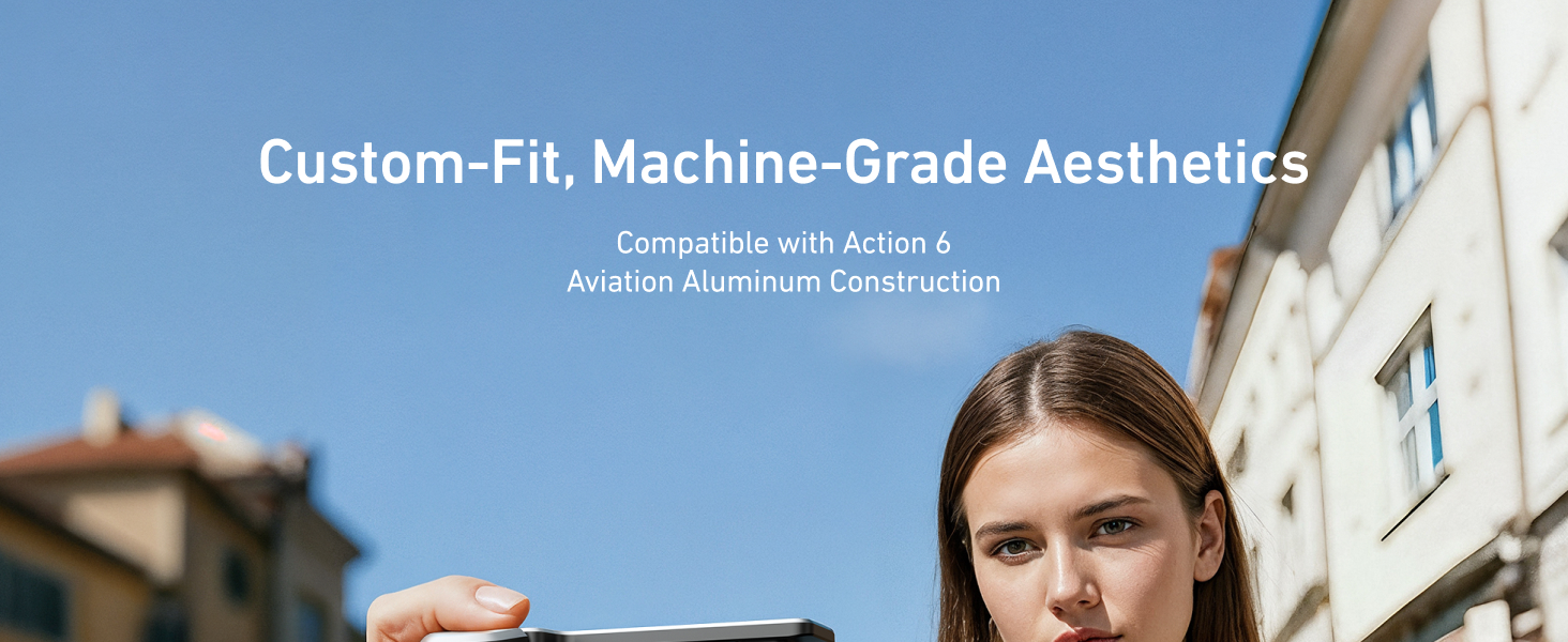 【Machined-to-Fit Aesthetic Rugged Durability】Engineered exclusively for the Action 6, this custom cage and grip set is CNC-machined from 6-series aerospace-grade aluminum. Every opening is precisely aligned with real-device measurements, ensuring full compatibility with the camera’s native buttons and ports.