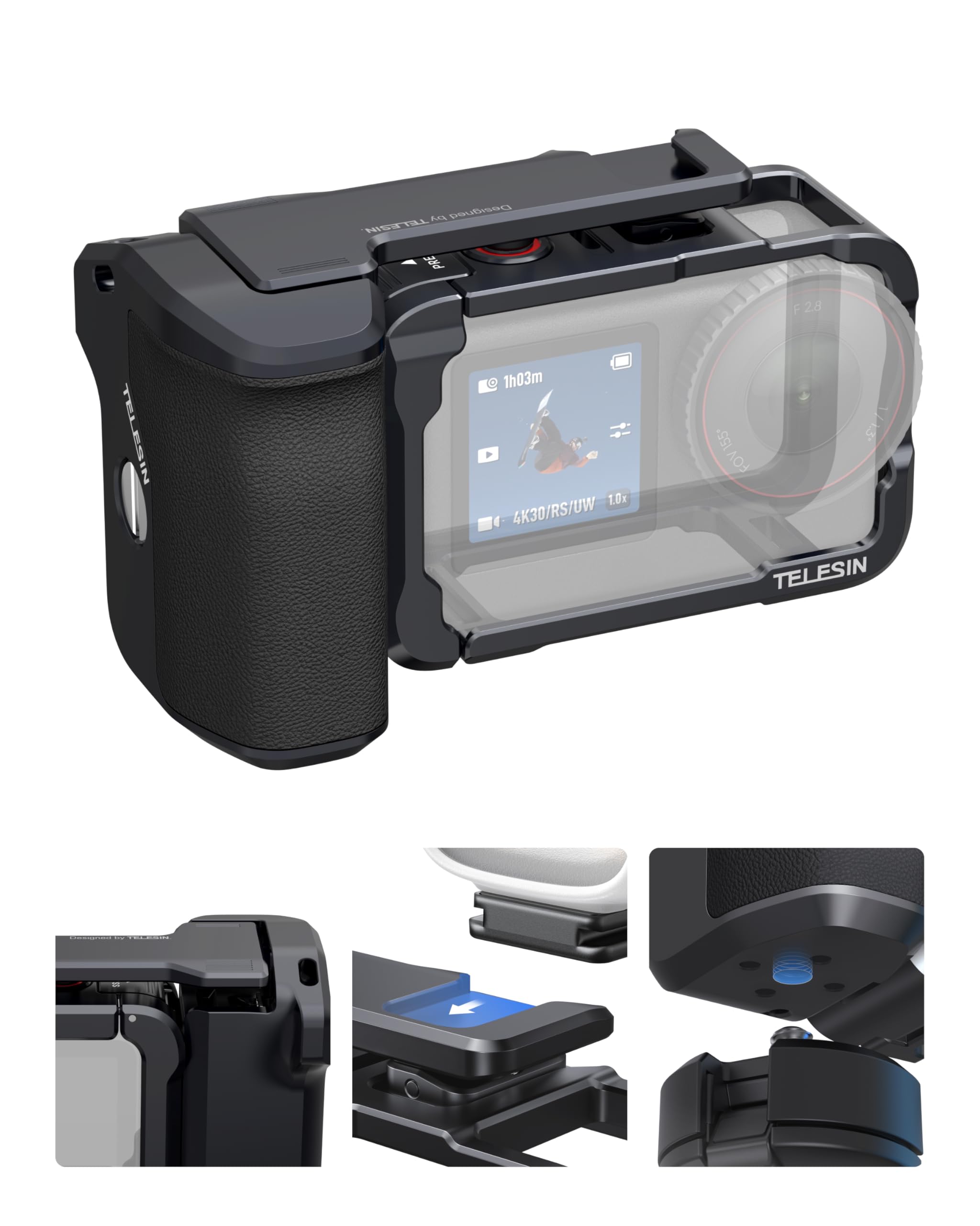 TELESIN Metal Aluminum Alloy Street Grip Kit for DJI Action 6 with Metal Cage Camera Grip Holder with Seesaw Shutter Button Aluminum Alloy Shell Backup TF Card Slot Quick Battery Access