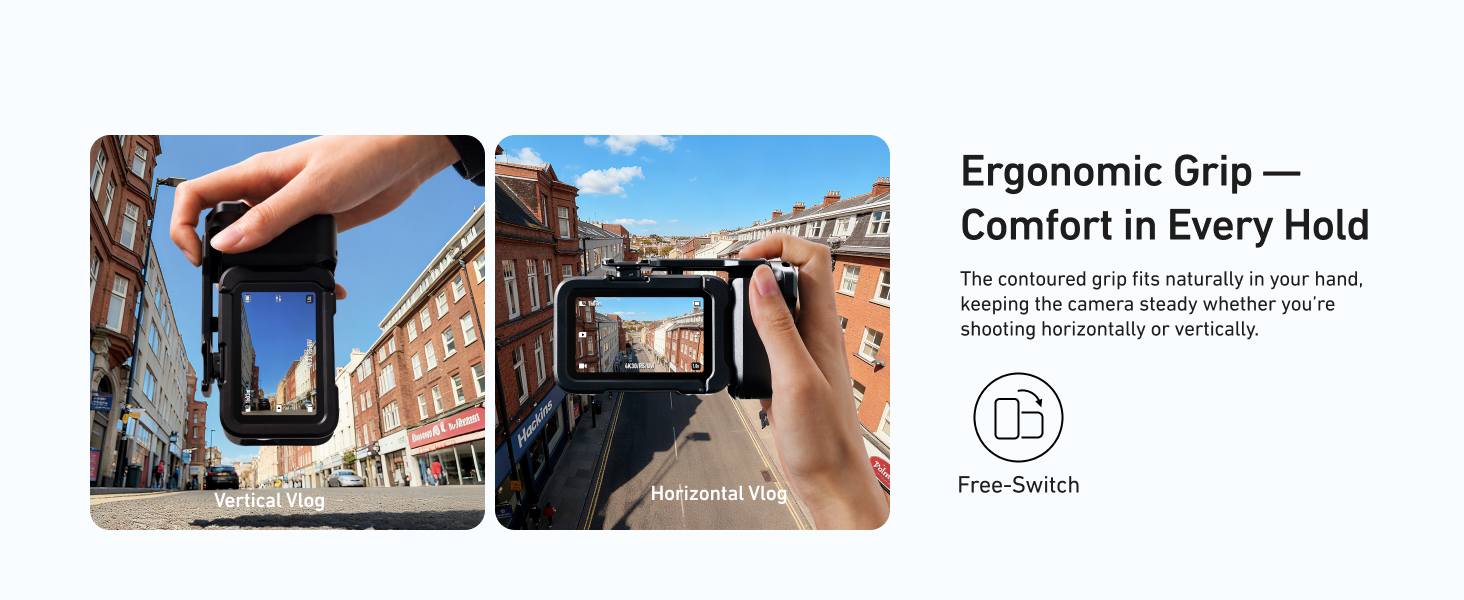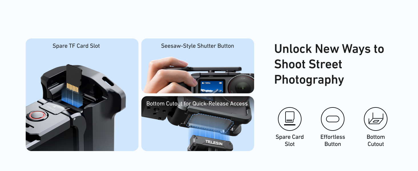 【Patented Seesaw Shutter Button】TELESIN camera grip kit replacing hard-press shutter buttons of traditional accessories. Paired with TELESIN-Patented Seesaw Button’s mechanism, it eliminates wasted effort. A light press is all it takes for a crisp, instant shutter response.