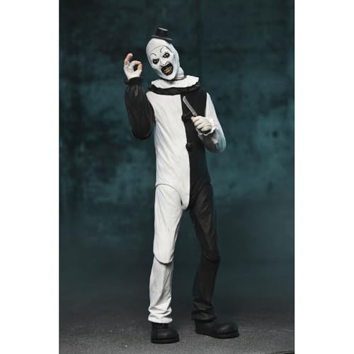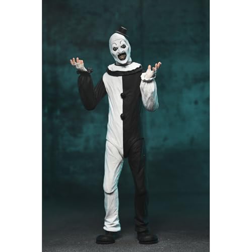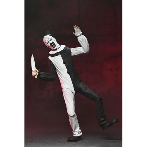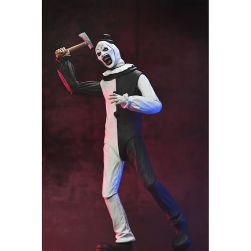 Neca Add to his Ultimate collection the articulated figure of Art the Clown, the chilling killer clown from the movie “Terrifier”. This 7-inch figure includes 3x interchangeable face plates, 3x pairs of hands, 5x knives, 1x saw, 1x drill, 1x gun, 1x doll, 1x trash bag and other accessories that evoke the film’s most disturbing scenes. Comes in a window box with front flap.
