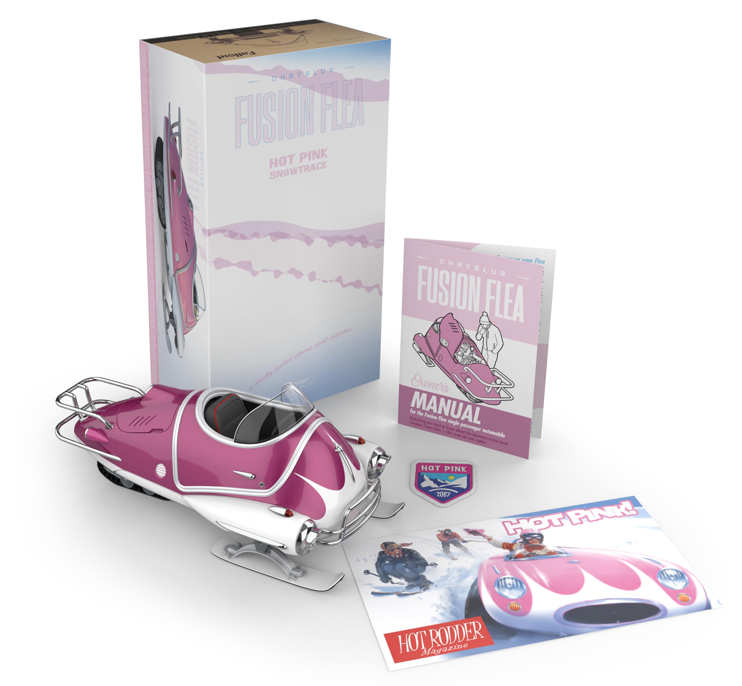 - Collectible accessories: Hot Pink Snowtrack Hot Rodder Magazine postcard and commemorative fabric mini patch.
