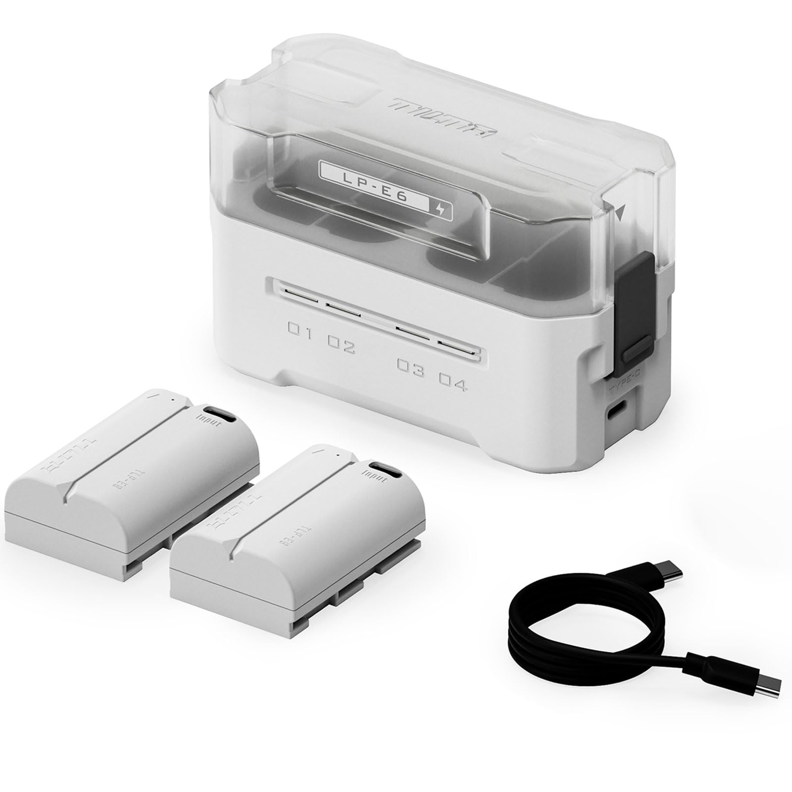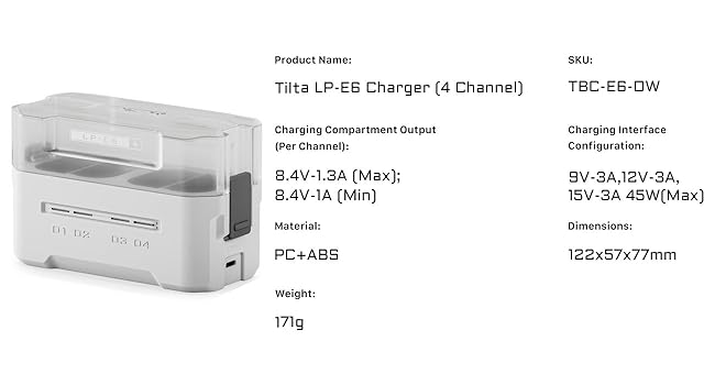 Combining storage and charging. Accommodating up to four Canon or third-party batteries. Featuringreal-time charging status indicators.Supports simultaneous charging of four batteries, with a total charging power of up to 45W.