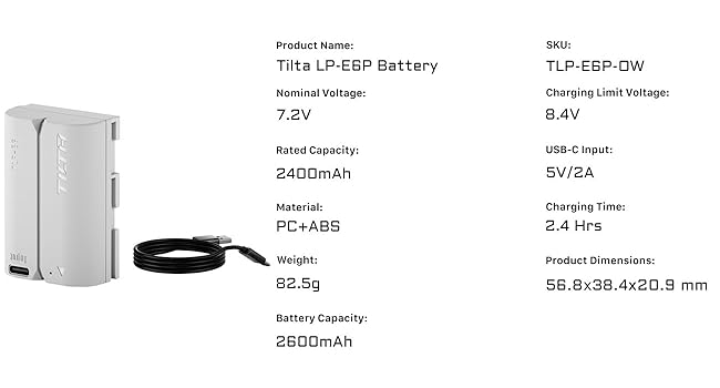 One Tilta LP-E6P battery allows shooting ≥529 photos and video recording for ≥2 hours, offering strong and lasting endurance.