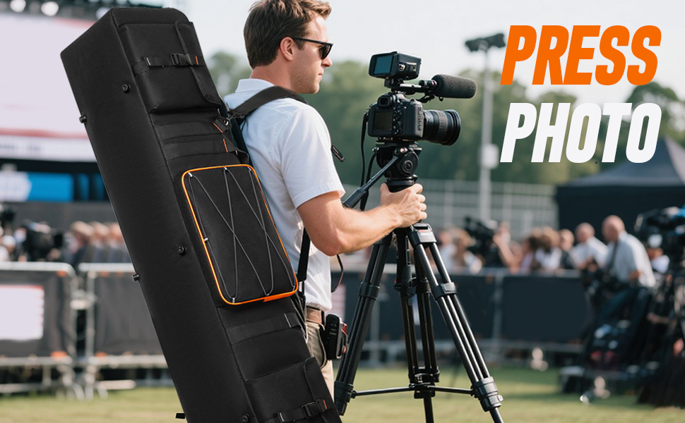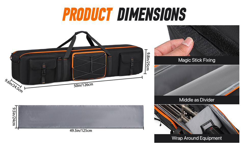 - Large space: Tripod Carrying Case Upgrade to a larger size50*9.6*9.8in, can effectively hold multiple equipment. The main compartment is compatible with light stands, boom stand, umbrellas, monolights, LED lights, flashes, gimbals, and other photographic equipment and accessories