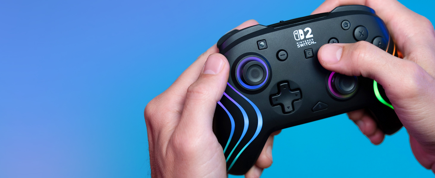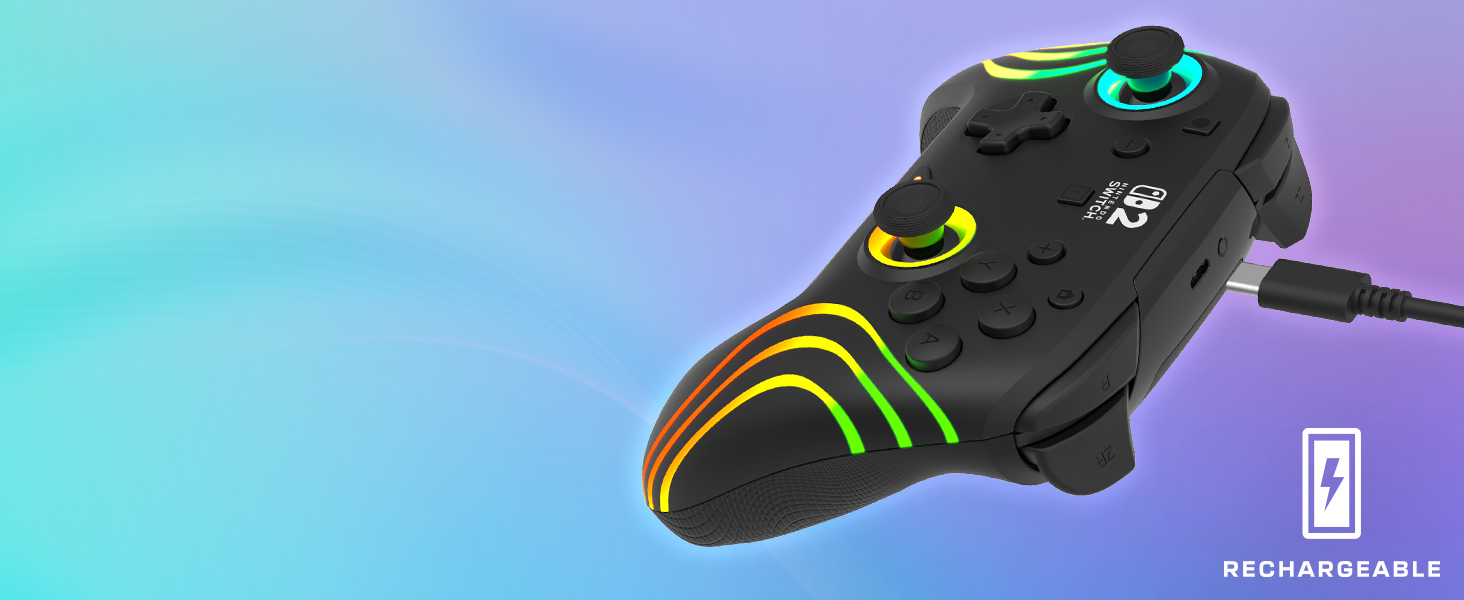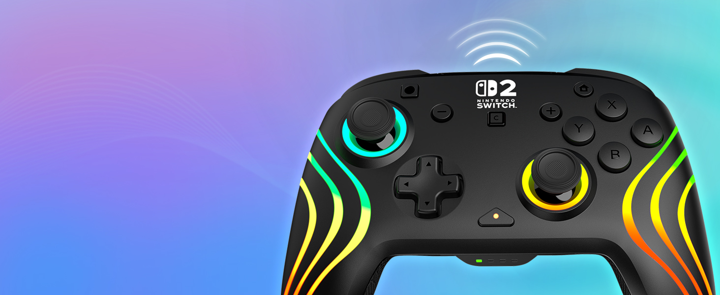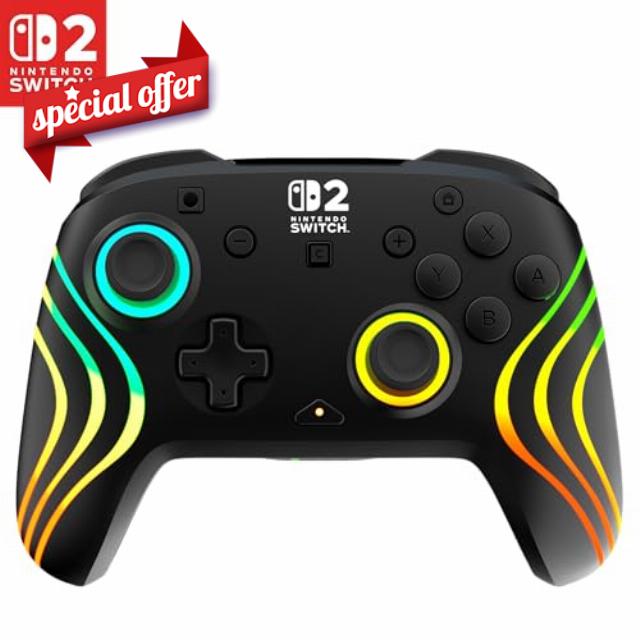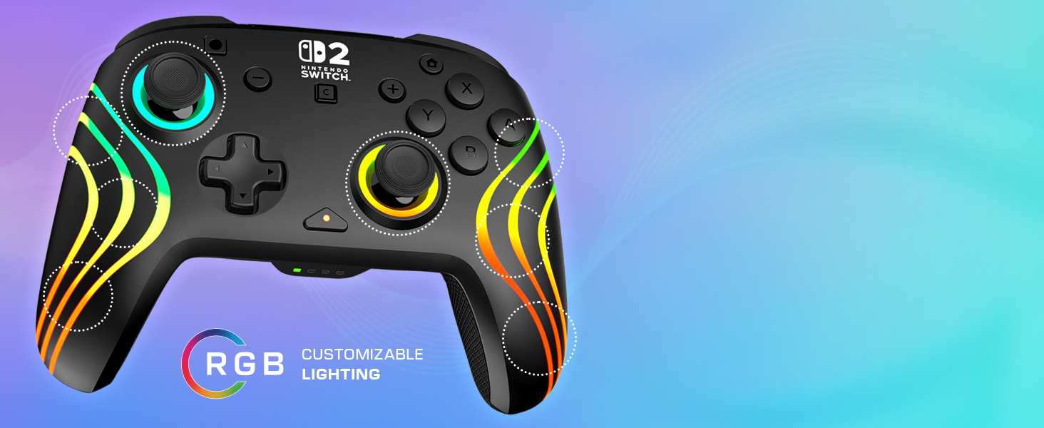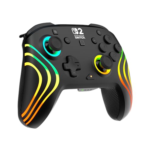 Brighten your gaming experience with the Afterglow Wave Wireless RGB Gaming Controller for Nintendo Switch™ 2. This controller also works with Nintendo Switch™, Nintendo Switch™ Lite, and Nintendo Switch™ – OLED Model.Featuring eight customizable RGB zones and four preset modes, you can match the lighting to your style or mood. Thumbsticks with integrated TMR (Tunneling Magnetoresistance) sensor technology offer precision and durability, while built-in motion controls enhance responsiveness. Access GameChat features quickly with the conveniently placed C Button. Enjoy up to 20 hours of wireless play thanks to the rechargeable battery. Officially licensed by Nintendo®, this controller delivers vibrant style, reliable performance, and all-day comfort for every gaming session.