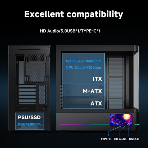 - ATX size: The AC-02 computer case supports ATX, microATX and Mini-ITX motherboards, and the I/O ports include HD audio/3.0USB*1/TYPE-C*1, 2.5 inch drive bays *3 and 3.5 inch drive bays *4