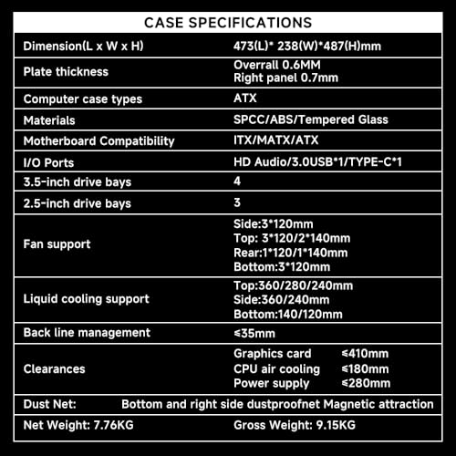 - Perfect room layout: With external dimensions of 473 mm (L) x 238 mm (W) x 487 mm (H), the AC-02 case is designed for most mainstream hardware and supports GPU heights of up to 410 mm, CPU cooling heights of up to 180 mm, top-mounted water cooling radiators of up to 360 mm and power heights of up to 280 mm