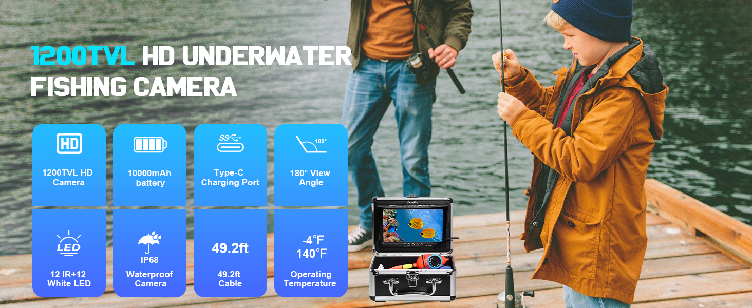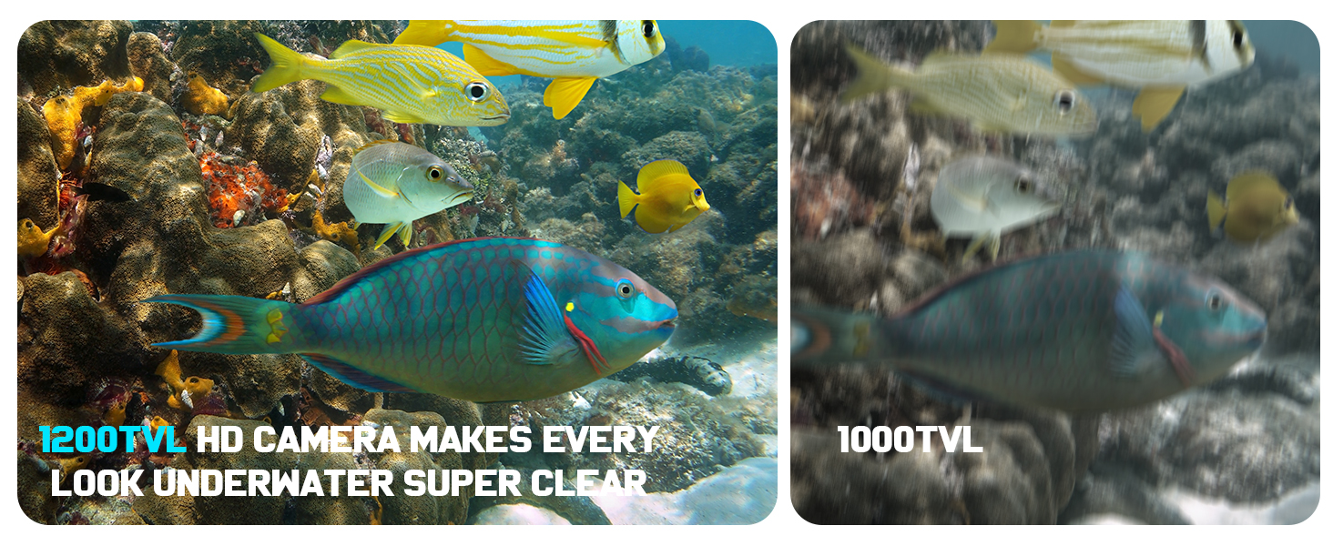 【Waterproof HD 1200TVL Camera】The 7 inch video underwater fishing camera with specially manufactured 1200TVL program chip, making you see the fishes more clearly in the dark environment. IP68 Waterproof for professional underwater fishing.