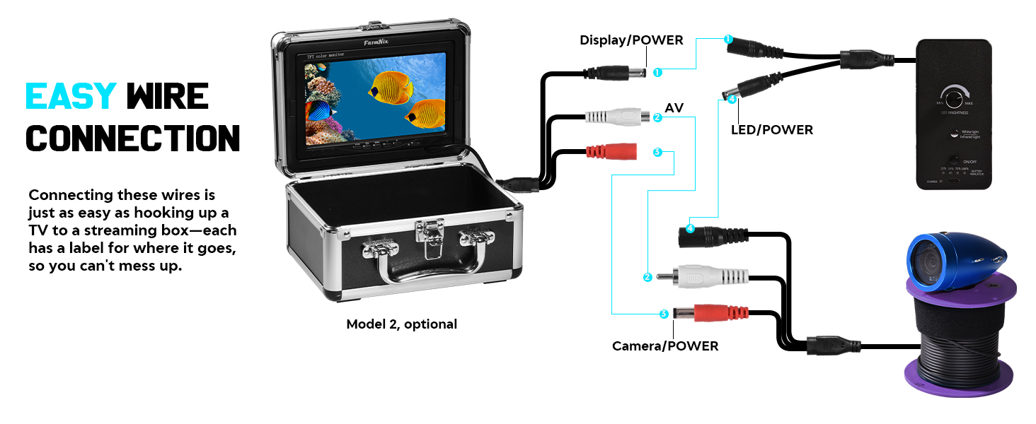 【7'' Underwater Fishing Camera】This professional video fish finder comes with a 7 inch Color LCD monitor and a hight definition camera which has HD 1200TV lines, and is equiped with a removable sun-visor ideal for bright environments, giving you more realistic and delicate images.