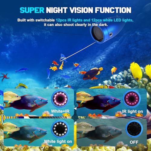 【Adjustable Infrared & White Lights】 The camera has been developed creatively to have two kinds of light 12 Infrared Lights & 12 White Lights which can be selected according to the using environment, especially in deep dark sea. The lights can be turned off as you like. Please note: the image will turn to black and white if you open the infrared light.