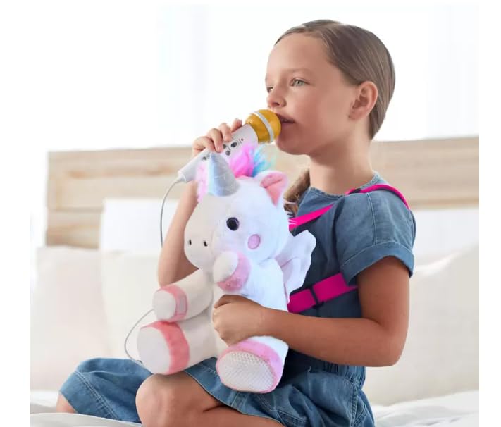 - MUSICAL COMPANION: Uni Queen unicorn plush backpack features a built-in speaker and wired microphone for karaoke fun, perfect for young music enthusiasts