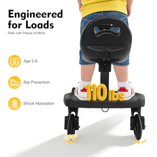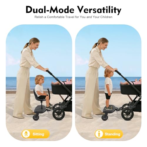 Universal Buggy Board with Seat, 2 in1 Kiddy Board Stand or Seat, Stroller Board 50kg, Removable Seat, Adjustable Standing Board, 360° Shock-Absorbing Wheels for 2-6 Year Olds