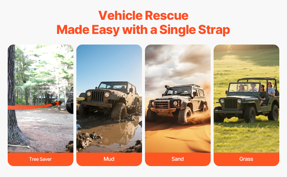 Adventure-Ready Versatility: From deep mud, slippery snow, and desert exploration to mountain rescue, our recovery rope is up for any challenge. It's compatible with multiple vehicle types, including SUVs, pickups, trucks, boats, ATVs, and more. It can be used as a tray pull strap, lifting sling, and tree saver.
