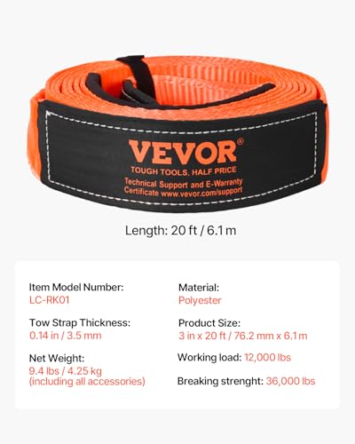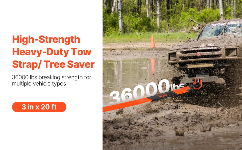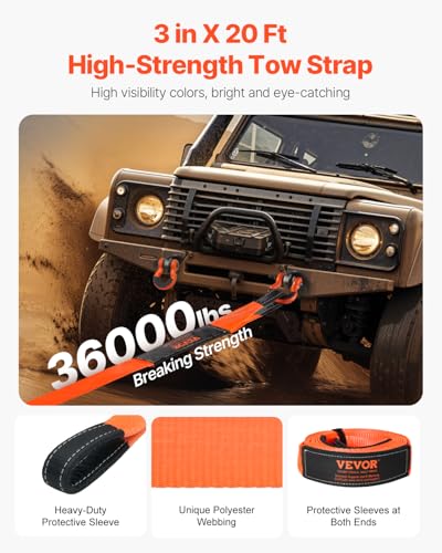 VEVOR Heavy Duty Tow Strap Recovery Kit 3 in x 20 ft (MBS-36,000 lbs) Tree Saver Winch Strap, Triple Reinforced Loop & Protective Sleeves & Storage Bag, 3/4″ D-Ring Shackles, for Truck Jeep SUV ATV