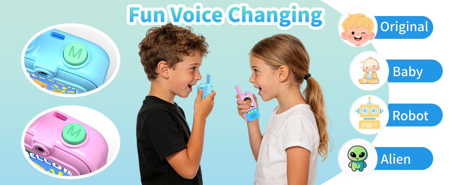- 【Hilarious Voice Changer Modes】Our childrens walkie talkies has 4 sound effects (original, child, robot, alien). Short press the "M" key to switch between the 4 voice modes, which can stimulate children's creativity – perfect for role-playing, silly games, and turn every conversation into a fun little show.