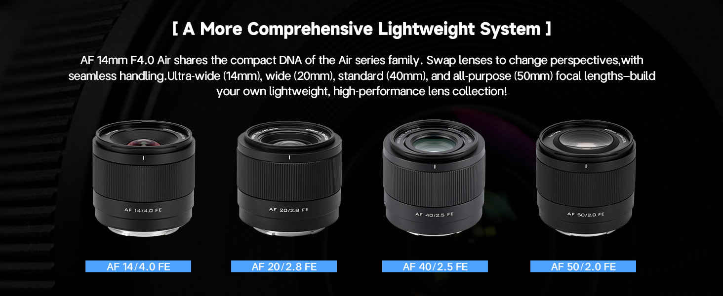 Ultra-wide (14mm), wide (20mm), standard (40mm), and all-purpose (50mm) focal lengths—build your own lightweight, high-performance lens collection!