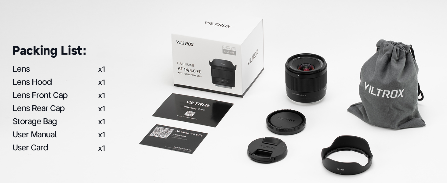 1*Lens / 1*Lens Hood / 1*Lens Front Cap / 1*Lens Rear Cap / 1*Storage Bag / 1*User Manual / 1*User Card