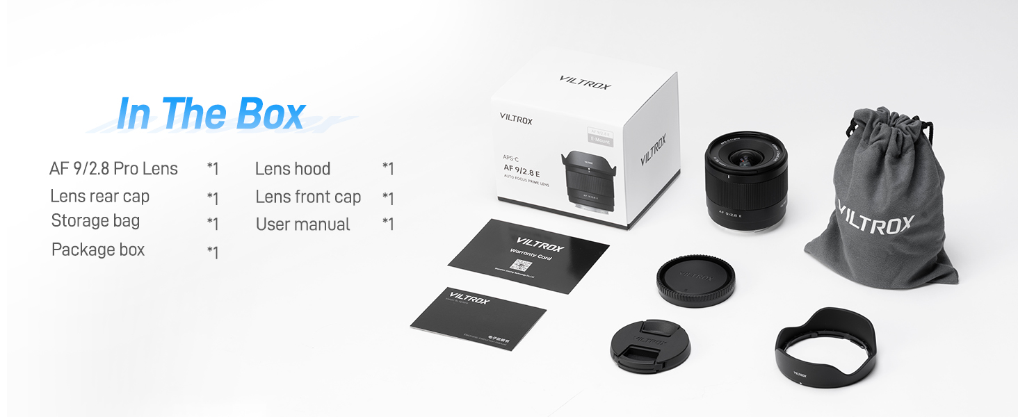 1*Lens / 1*Lens Hood / 1*Lens Front Cap / 1*Lens Rear Cap / 1*Storage Bag / 1*User Manual / 1*User Card
