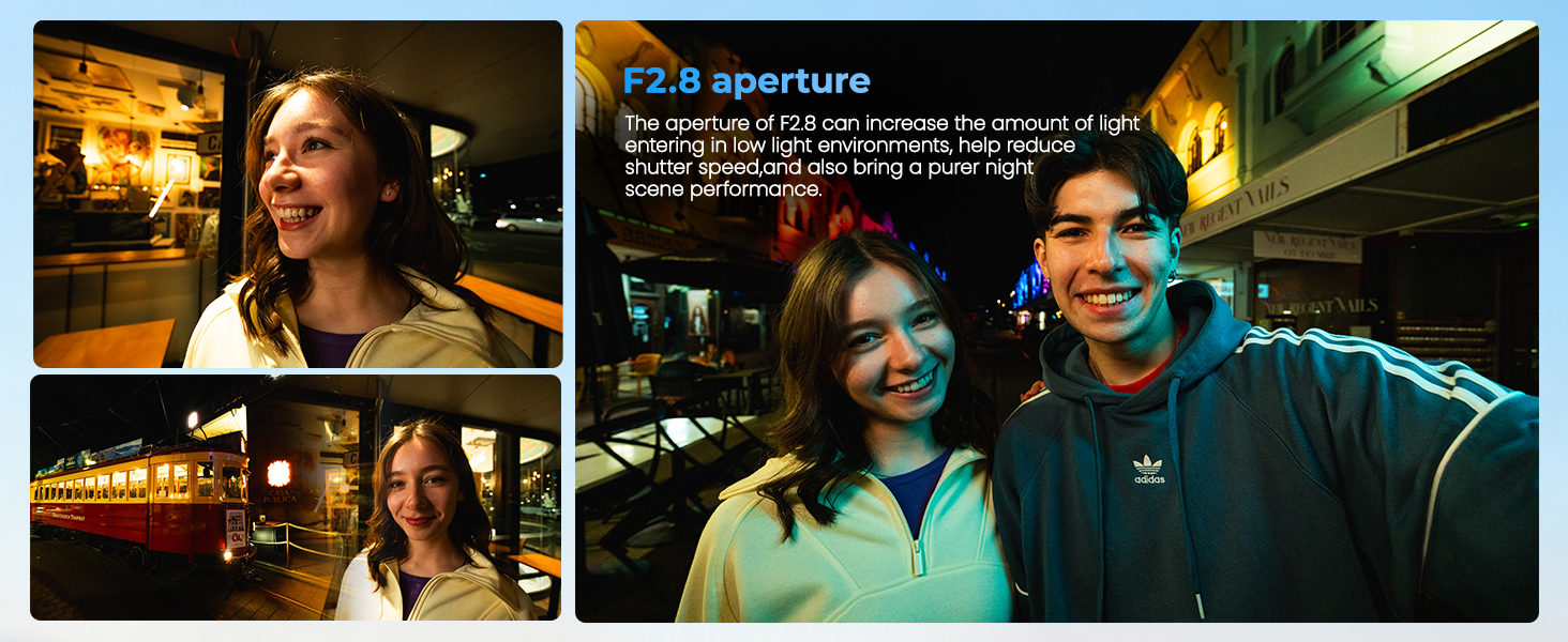 The aperture of F2.8 can increase the amount of light entering in low light environments, help reduce shutter speed, and also bring a purer night scene performance.