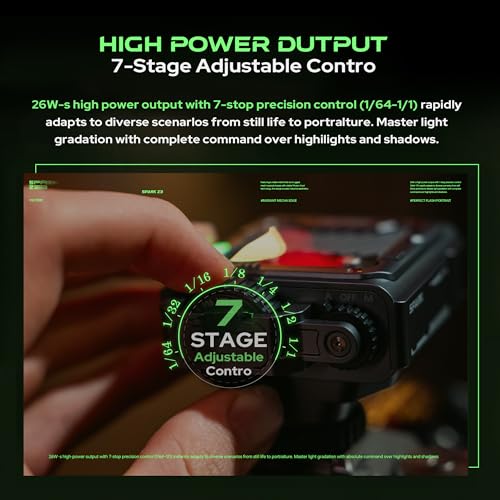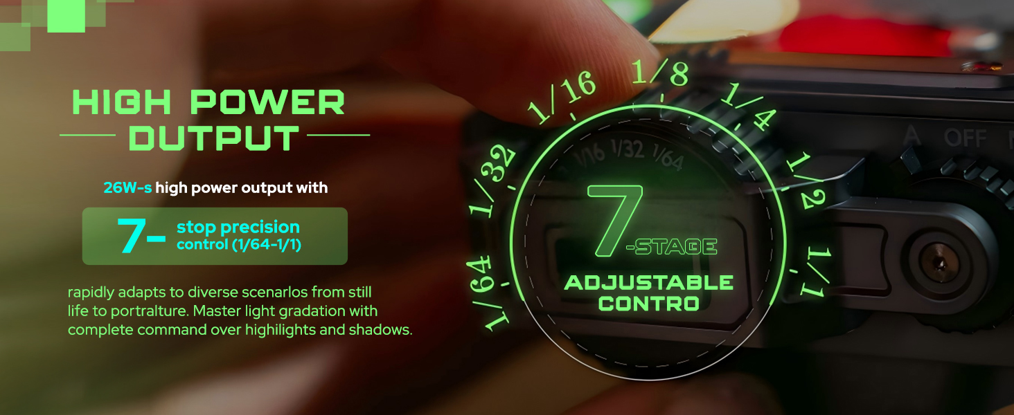 - 7-Stop Precise Adjustment: Power range from 1/64 to 1/1, delivering a powerful 26Ws output for versatile lighting control.