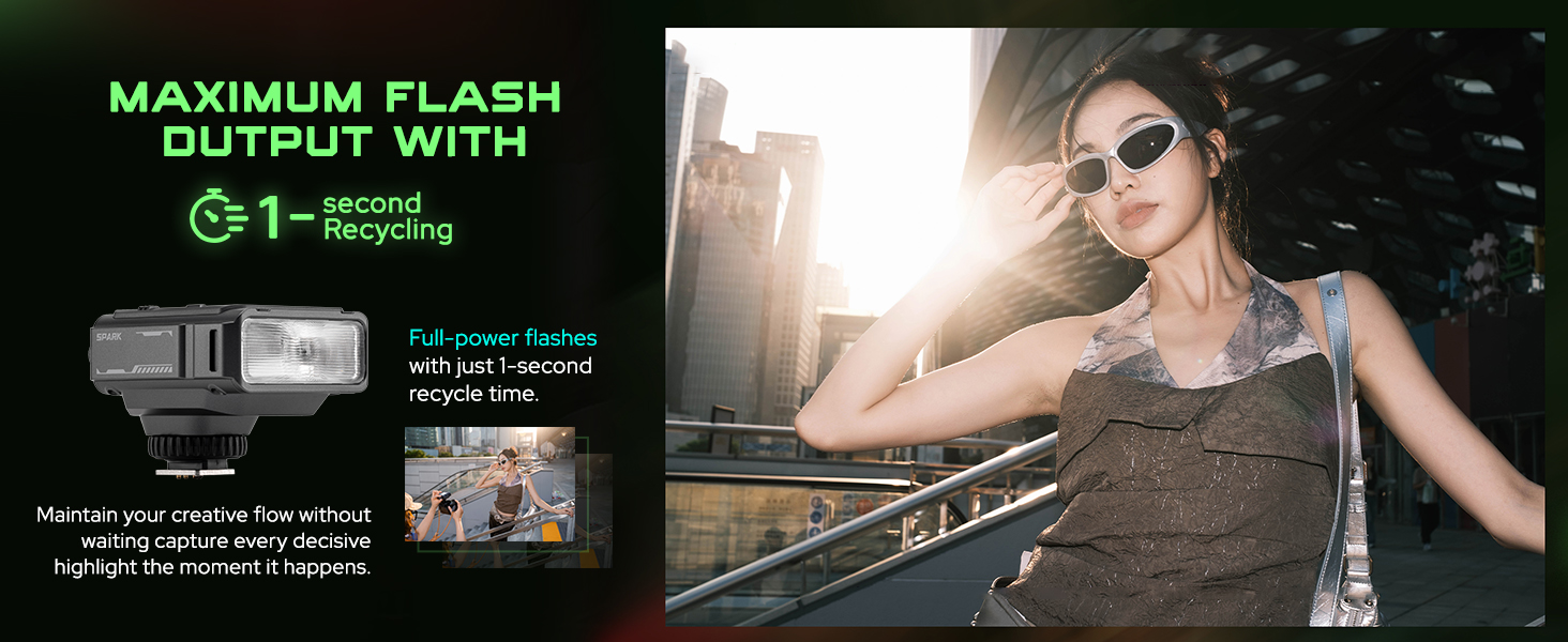 - 1s Rapid Recycle: 1-second recycle at full power keeps your photography flowing, never missing a shot.