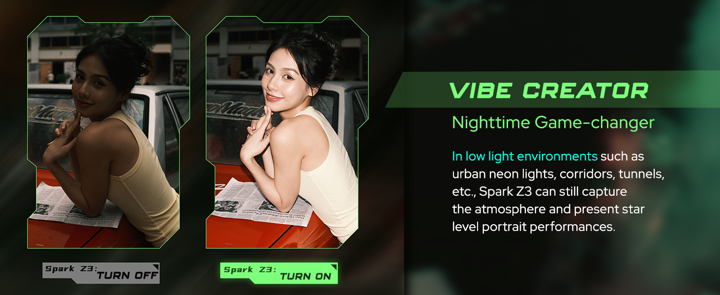 The Spark Z3 packs studio-grade performance into its tiny frame, delivering stunning portraits even in extreme lowlight conditions.