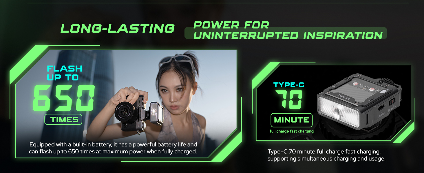 Flash up to 650 times, Type-C 70 minutes to full charge, support simultaneous charge and usage.