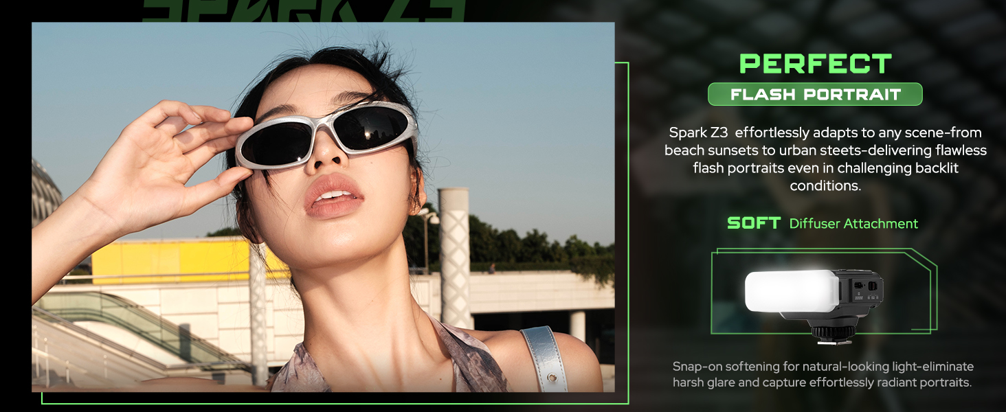 Spark Z3 effortlessly adapts to any scene, delivering flawless flash portraits even in challenging backlit conditions. Soft diffuser included.