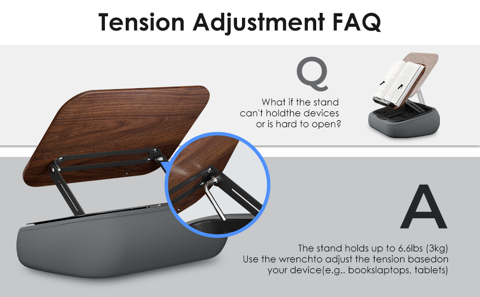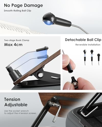 【Large Dark Wood Panel with Upgraded Two-Stage Page Holder】The sturdy dark wood panel supports A5–A3 books, thick hardbacks, 7–15 inch tablets, e-readers, and even laptops. The upgraded two-stage page holder (up to 4 cm) securely holds thick books, making it a reliable book holder for bed and sofa.