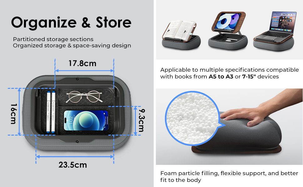 【Built-In Storage for Reading Essentials】Lift the top panel to reveal a practical storage compartment (23.5 × 16 × 3.5 cm), perfect for glasses, pens, bookmarks, phones, sticky notes, AirPods, and other small accessories. This upgraded book holder keeps your reading area tidy and everything within easy reach.