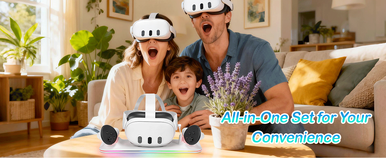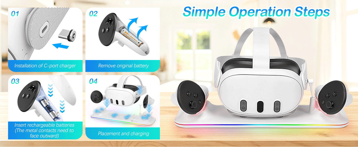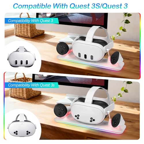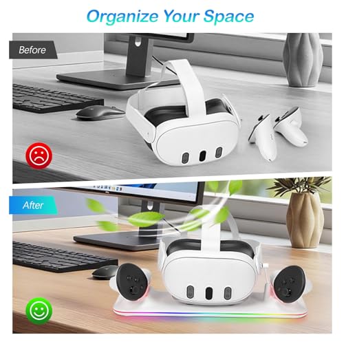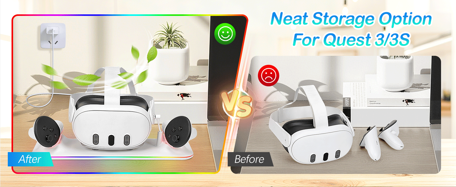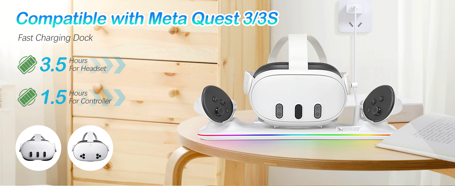 - 【All-in-One Charging Dock】The charging dock for Meta Quest 3S/Quest 3, provides all-in-one charging solution for VR headset and controllers. It can also be used as a display storage to prevent equipment from being scratched, does not take up space, and makes the desktop more concise.