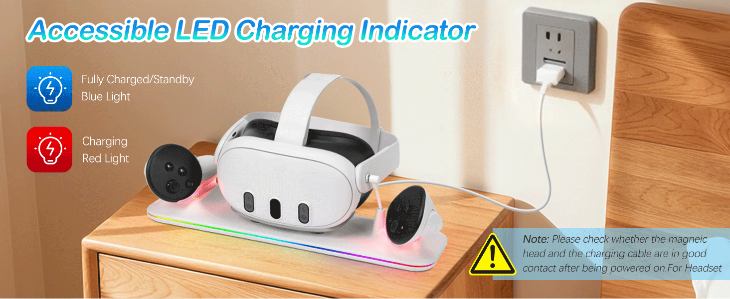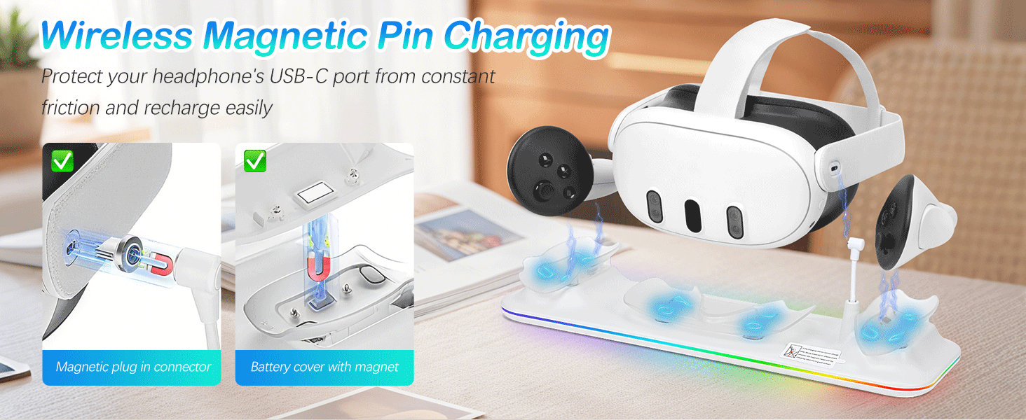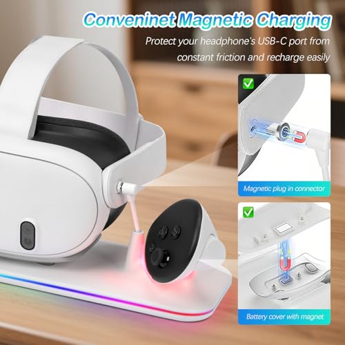 - 【Power Magnetic Charging Dock】The magnetic plug-in design provides secure connection and eliminates the problem of poor contact between the charging dock and Meta Quest 3S/Quest 3. Experience the seamless compatibility of this upgraded charging base with your Quest 3/3S headset and touch controller. Just pop in the headphones and controllers, and let them fully charge, always ready for your next VR session.