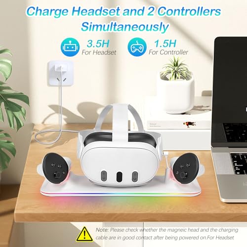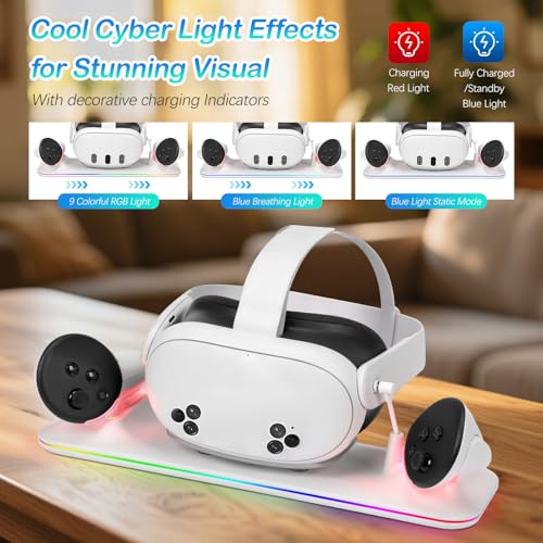 - 【Fast Charging】The VR charging station for Quest 3S/Quest 3 allows you to simultaneously charge your headset and touch controllers at the same time. Fully charge your headset in about 3 hours and controllers in about 3.5 hours, all while enjoying built-in protection against overheating.
