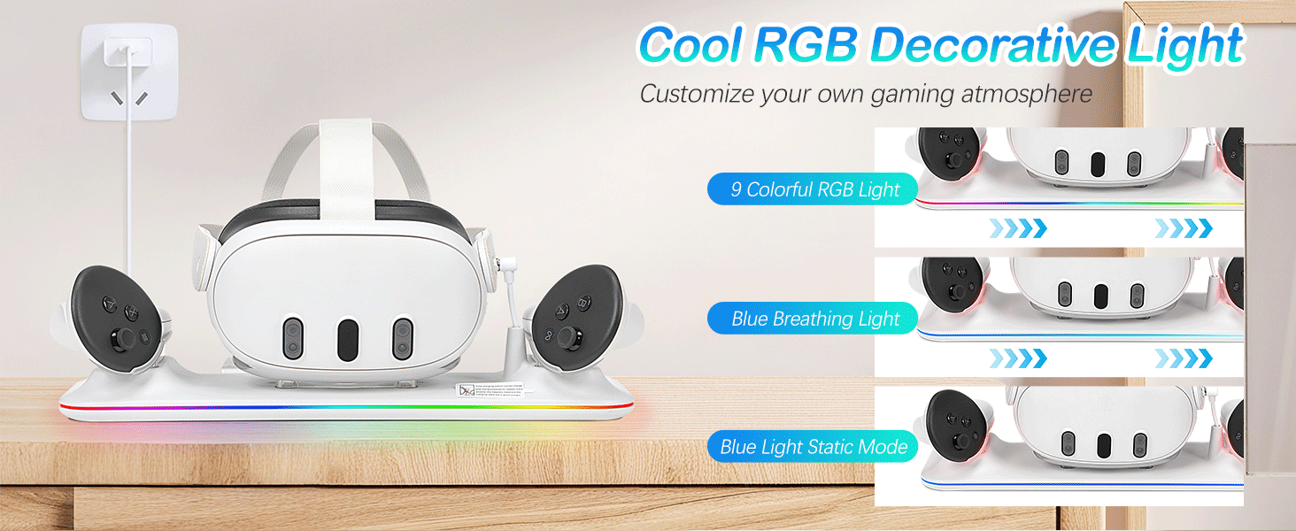 - 【Colorful RGB Lighting Mode】This VR Charging Dock is designed with a circle of colorful RGB lights at the bottom, the unique distribution of lighting effects creates a cool atmosphere to show off your gaming atmosphere and personal style. While allowing you to easily monitor the charging status, red light means charging, blue light means fully charged or in standby mode.