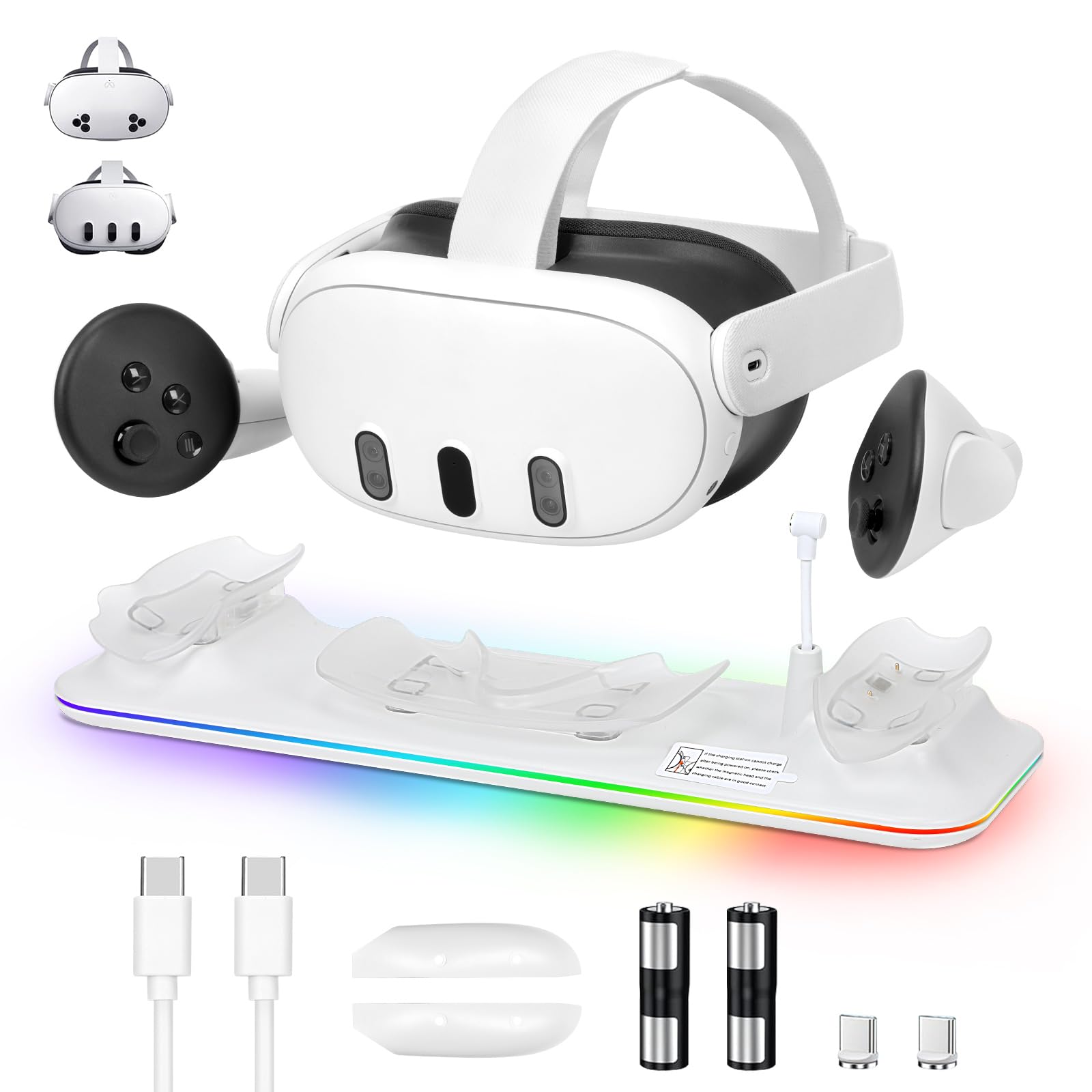 VR Charging Dock for Meta Quest 3S/Quest 3 Fast Charging Station with RGB Light LED Indicator Magnetic Charging Dock Station for VR Headset & Controllers with 2 Rechargeable Batteries