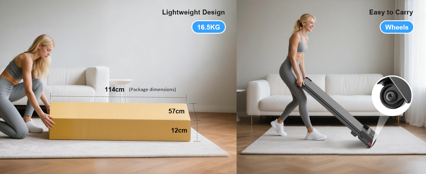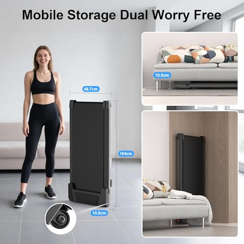 [Space Saving and Stable Design]Treadmill is 104 centimeters long, 48.7 centimeters wide, 10.5 centimeters high, and has a net weight of 16.5 kilograms. The treadmill can be placed under a table or in a small space. Its slim appearance and non foldable structure ensure stability during use.
