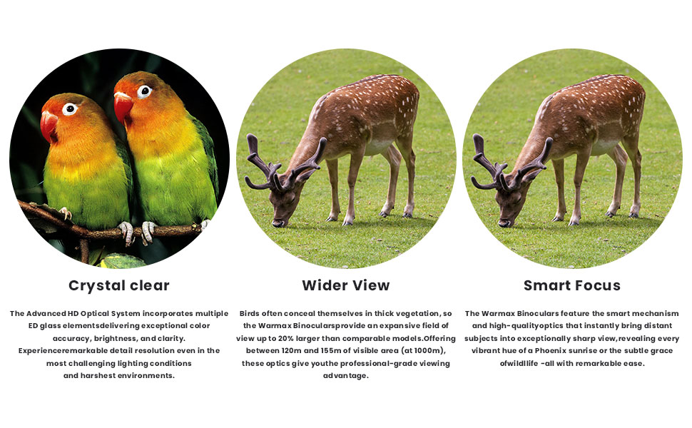 【See Every Detail, Clearly】The Warmax Smart Focus Binoculars are built with a high-definition optical system using premium ED glass elements. This ensures vivid colours, sharp detail, and excellent brightness – even at dusk, dawn, or in challenging weather