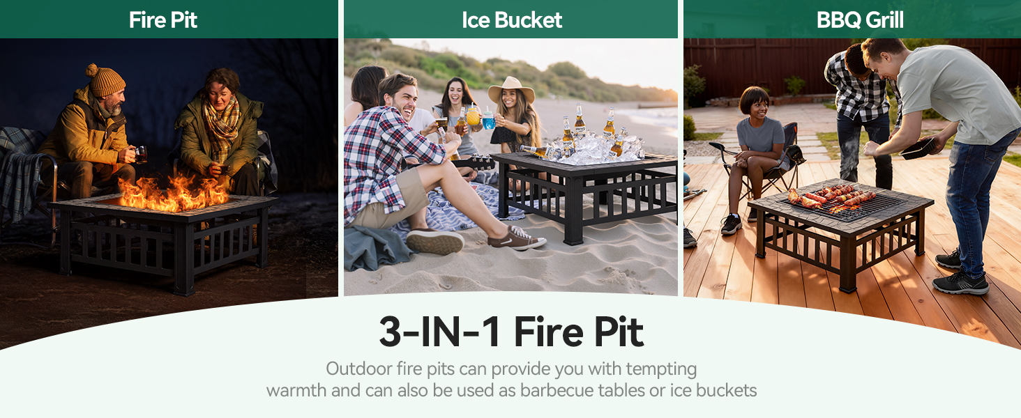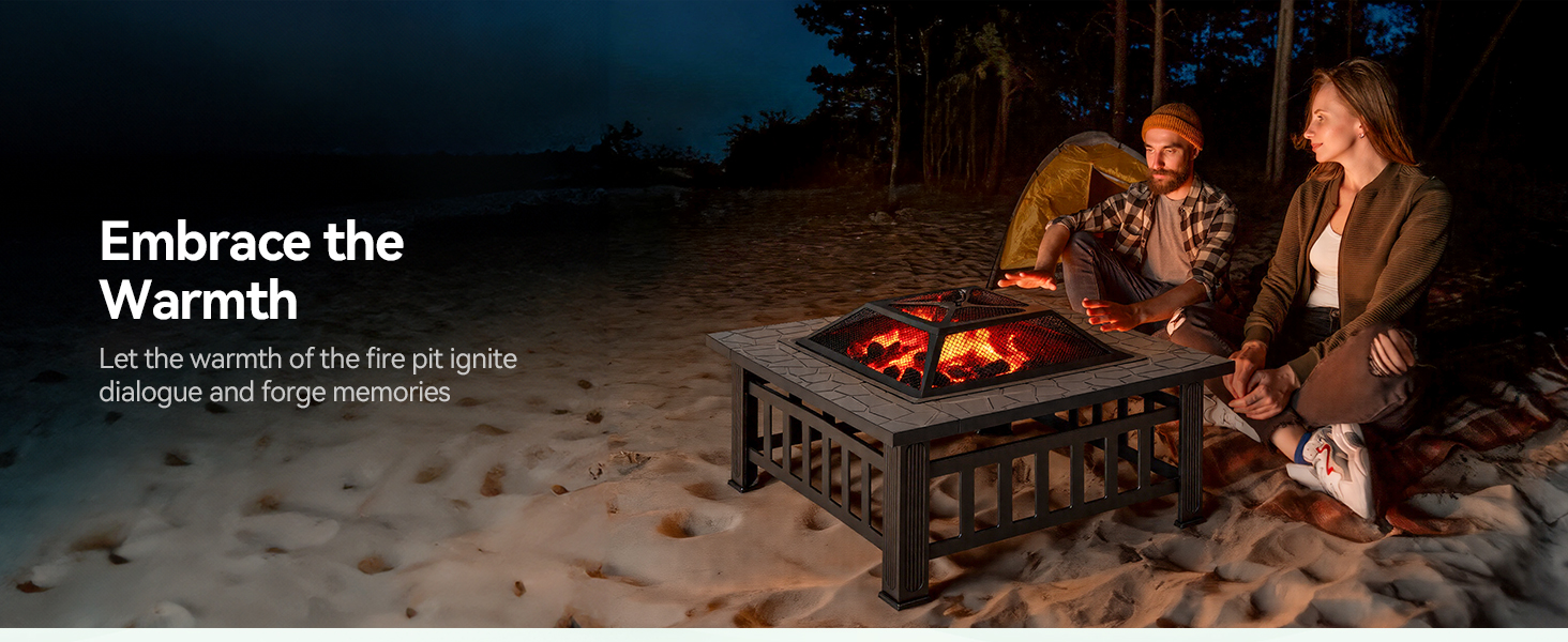 Large-Capacity Fire Pit: Our fire pit measures 81L*81W*36H CM. It is equipped with a fire bowl with a width of 57.5CM and a depth of 12CM. There is also a 30*30 cm grill and 40CM long poker, making it very suitable for bonfires, barbecues, camping and other outdoor gatherings.