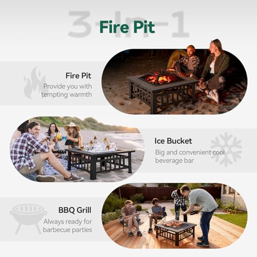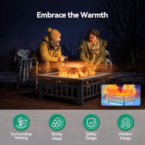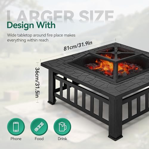 Warmiehomy Fire Pit For Garden, Outdoor Fire Pit Metal Wood Burning Square Firepits with Spark Protector Screen, Grate, Poker, Camping Firepit Table For Barbecue, Heating, Cooling (81L*81W*36H CM)
