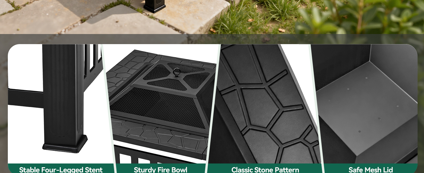 Durable Structure: Our fire pit is made of solid iron metal and coated with weather-resistant powder coating on the outside, which can prevent rust and withstand harsh weather conditions, ensuring long-term use. Its reinforced base frame ensures the stability of the fire bed.