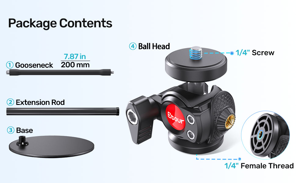 - 【Package Includes】1 x Etour Webcam Stand (Pole & Base), 1 x Gooseneck Stand, 1 x 360° Swivel Ball Head – your complete kit for effortless video calls, engaging interactions, and content capture. Have questions about your Etour Webcam Mount? We're here to help!