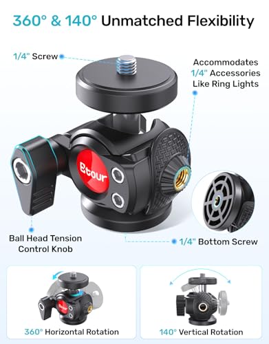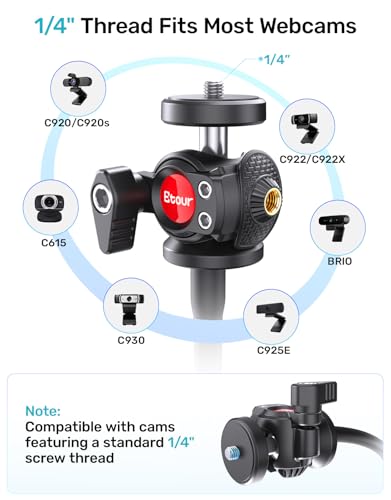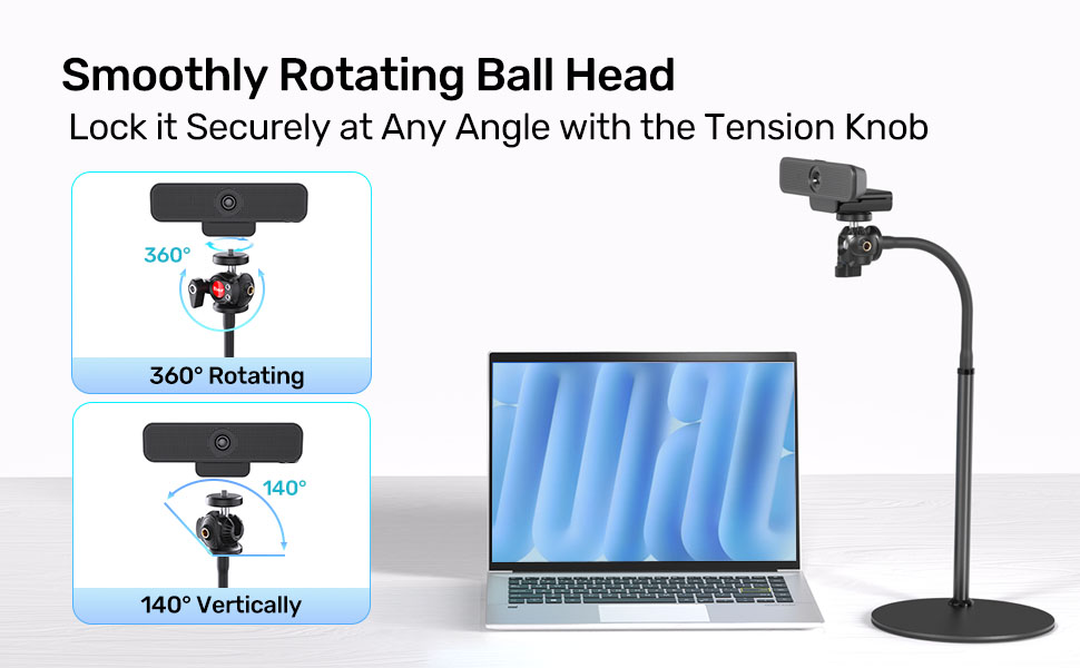 - 【1/4" Threaded Ball Head】Featuring a ball head with a standard 1/4-inch tripod thread, the camera stand enables precise 360° horizontal rotation and 140° vertical tilt for exact camera angling. The universal 1/4-inch thread ensures seamless compatibility with webcams using this standard, including the Logitech C922, C930, C920/BRIO, and NexiGo N60, among others. Additionally, it works flawlessly with small ring lights and phone holders.