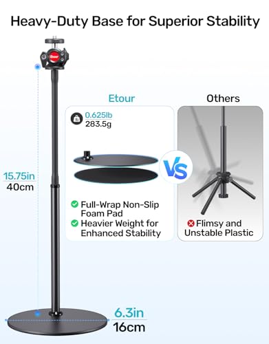 - 【Stable & Compact Base】The webcam stand features a sturdy, compact metal base that delivers rock-solid support. Unlike traditional tripods, this base sits flat and stable, resisting accidental bumps. Its full-coverage non-slip pads protect your desk from scratches and minimize noise during movement, creating a quieter environment for recording and live streaming.