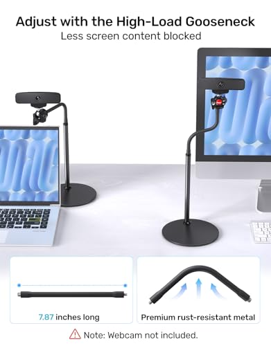 - 【Specially Designed Flexible Gooseneck】Equipped with a unique, flexible gooseneck, this web camera stand offers exceptional positioning freedom for your web camera. The 7.09-inch/18-cm gooseneck allows the pole stand to extend up to 15.2in/38.5cm tall. Strong yet slender, it minimally obstructs your screen, making it the ideal solution for Zoom call meetings, professional streaming, and content creation.