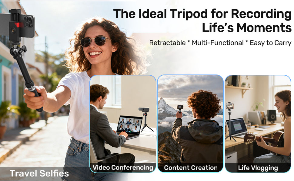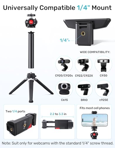 - 【Universal Device Compatibility】Equipped with a standard 1/4-inch screw mount, this tripod stand supports webcams (Compatible with Logitech C920/C922x/Brio 4K and more models and brands), DSLRs, smartphones (via included phone holder), ring lights, and action cameras. The included phone holder accommodates devices up to 3.4" wide—even with protective cases—making it a versatile all-in-one solution for multi-device creators, streamers, and remote professionals.