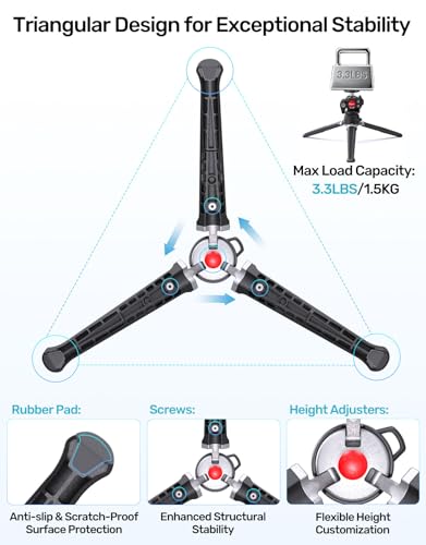 - 【Professional Stability & Durability】Engineered with reinforced premium materials, our webcam tripod mount delivers rock-solid stability for crystal-clear streaming and recording. The reinforced leg structure with anti-slip rubber feet prevents wobbling and tipping, and protects delicate surfaces like wood from scratches. Press the button at the base to lower the tripod’s center of gravity for enhanced stability—keeping your valuable equipment secure even during intense typing or accidental desk impacts. Never worry about shaky footage or damaged equipment again.