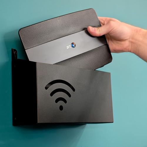 WiFi Router Wall Mount Storage Box – Textured Black – Steel Network Equipment Organiser with Cable Management – Free-Standing or Wall Mounted – UK Made